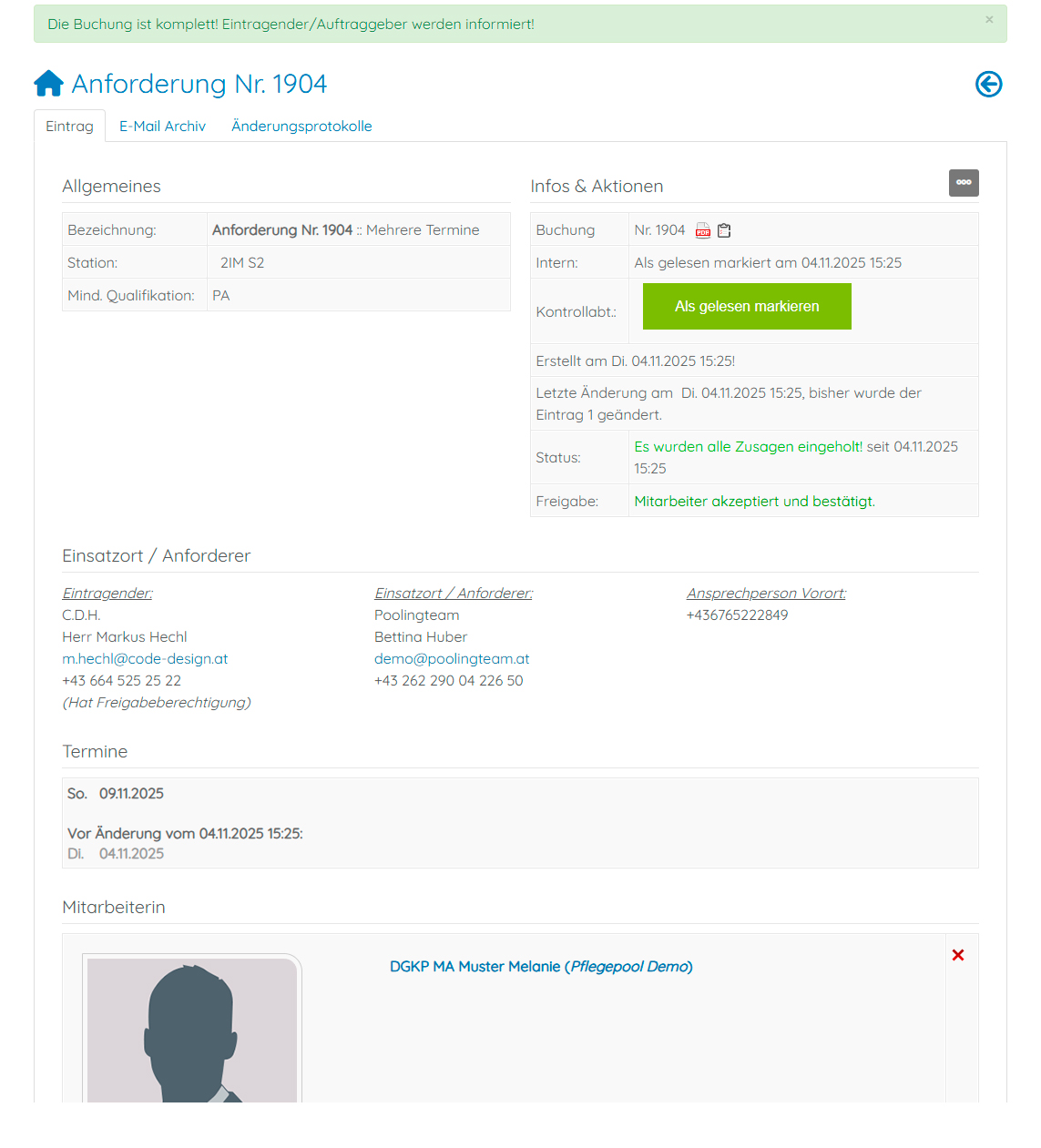 • Für Stationen: Unkomplizierte Anforderung von Pflegekräften und Rückverfolgbarkeit, ggf. Änderung von Anforderungen oder Stornierungen bei gleichzeitiger Information aller Beteiligten. Anforderungsbestätigung mit Doppelbuchungsschutz!